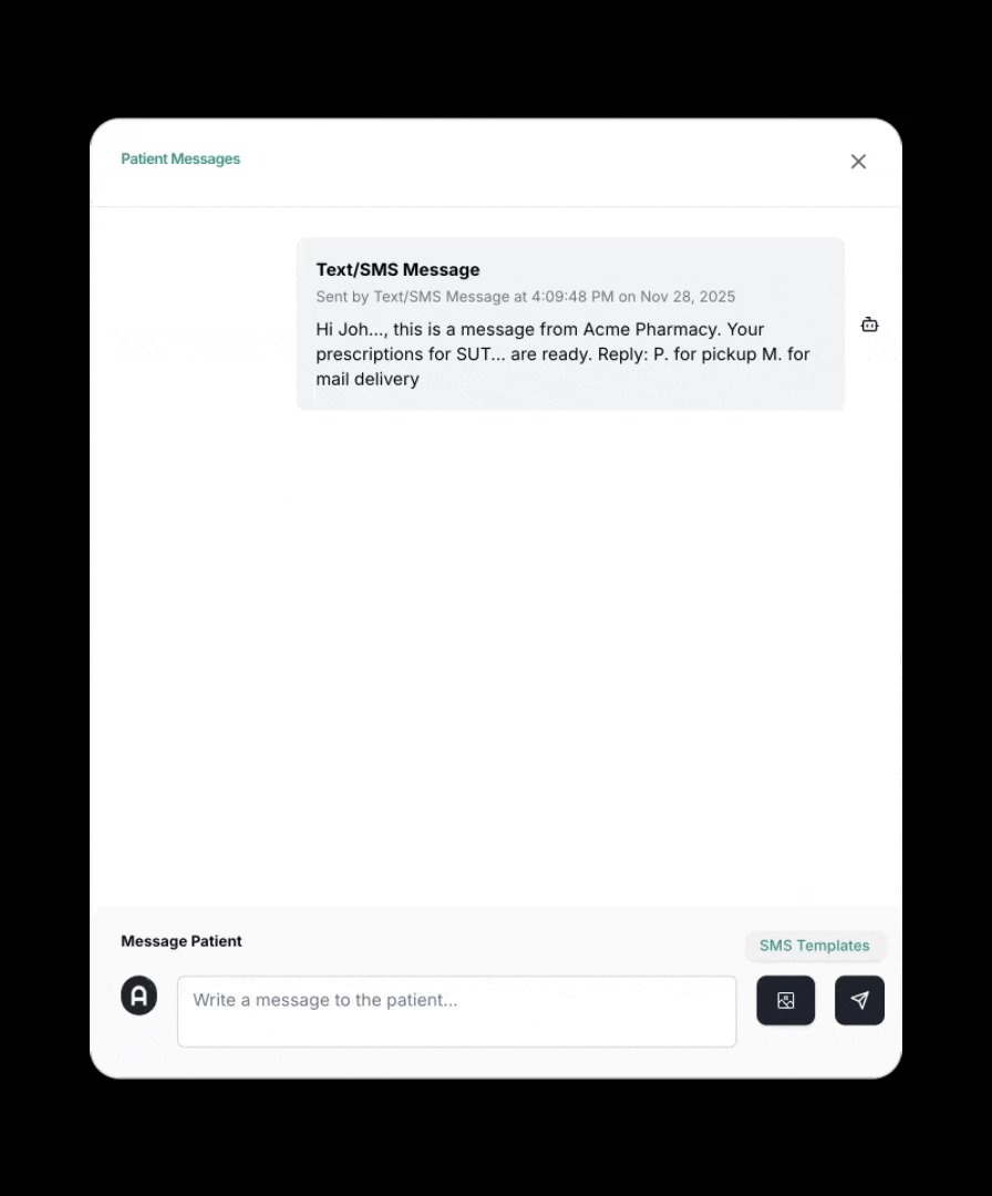 If there’s one channel pharmacy teams rely on every single day to reach patients, it’s text messaging. Patients read texts. They respond to texts. And clinics need fast, reliable, compliant ways to communicate with them. So today’s feature drop is all about speed and clarity. Text/SMS Templates for Instant Outreach, Send & Receive Photos via Text/SMS
