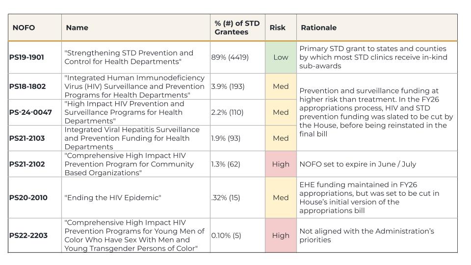 The good news is that this applies to the vast majority of grantees. More than 90% of STD clinics receive funding under NOFO PS19-1901, “Strengthening STD Prevention and Control for Health Departments.” These in-kind sub-awards from health departments are, in our view, the lowest-risk category. The remaining 10% of grantees, approximately 500 covered entities nationwide, rely on NOFOs that we view as medium or high risk. The most common grant types are outlined below.
